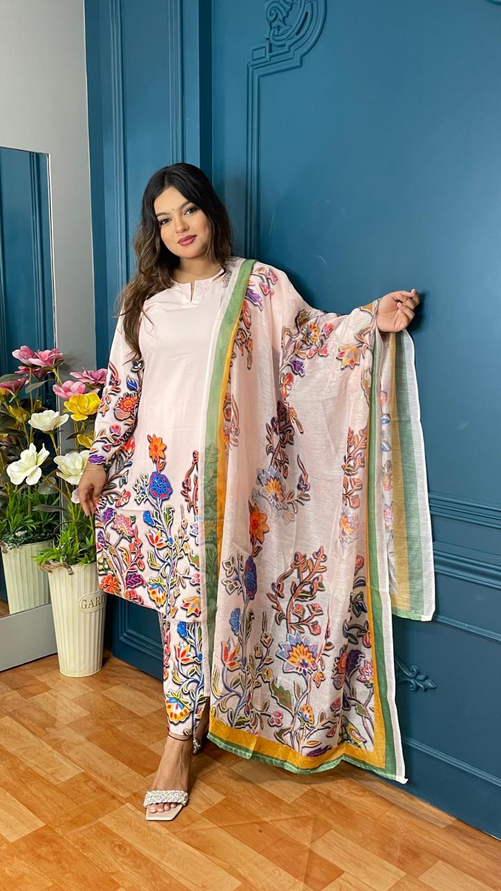 Embrace sophistication with the Floral Elegance Imported Silk Suit, a timeless ensemble designed for women who love grace and luxury. This premium Floral Silk Suit in Bangladesh is crafted from imported digital printed silk, offering a soft and elegant drape. The kameez and trouser feature a seamless blend of comfort and style, while the digitally printed texture dupatta adds a touch of charm, making it perfect for parties, festive celebrations, and special occasions.