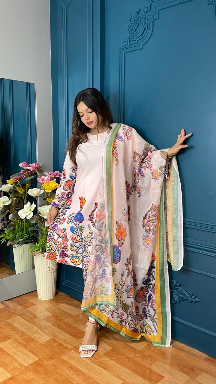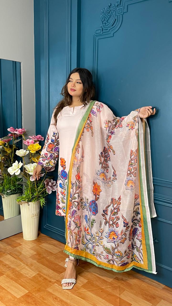Designed with an open side cut, a round neckline, and 21-22 inch sleeves, this stylish imported silk suit BD flatters all body types. The elastic waist trouser ensures a comfortable yet tailored fit, making it an ideal choice for both formal and casual wear. Whether you’re searching for the best floral silk suit for women BD or a premium floral silk suit for Eid collection, this elegant piece is a must-have in your wardrobe.