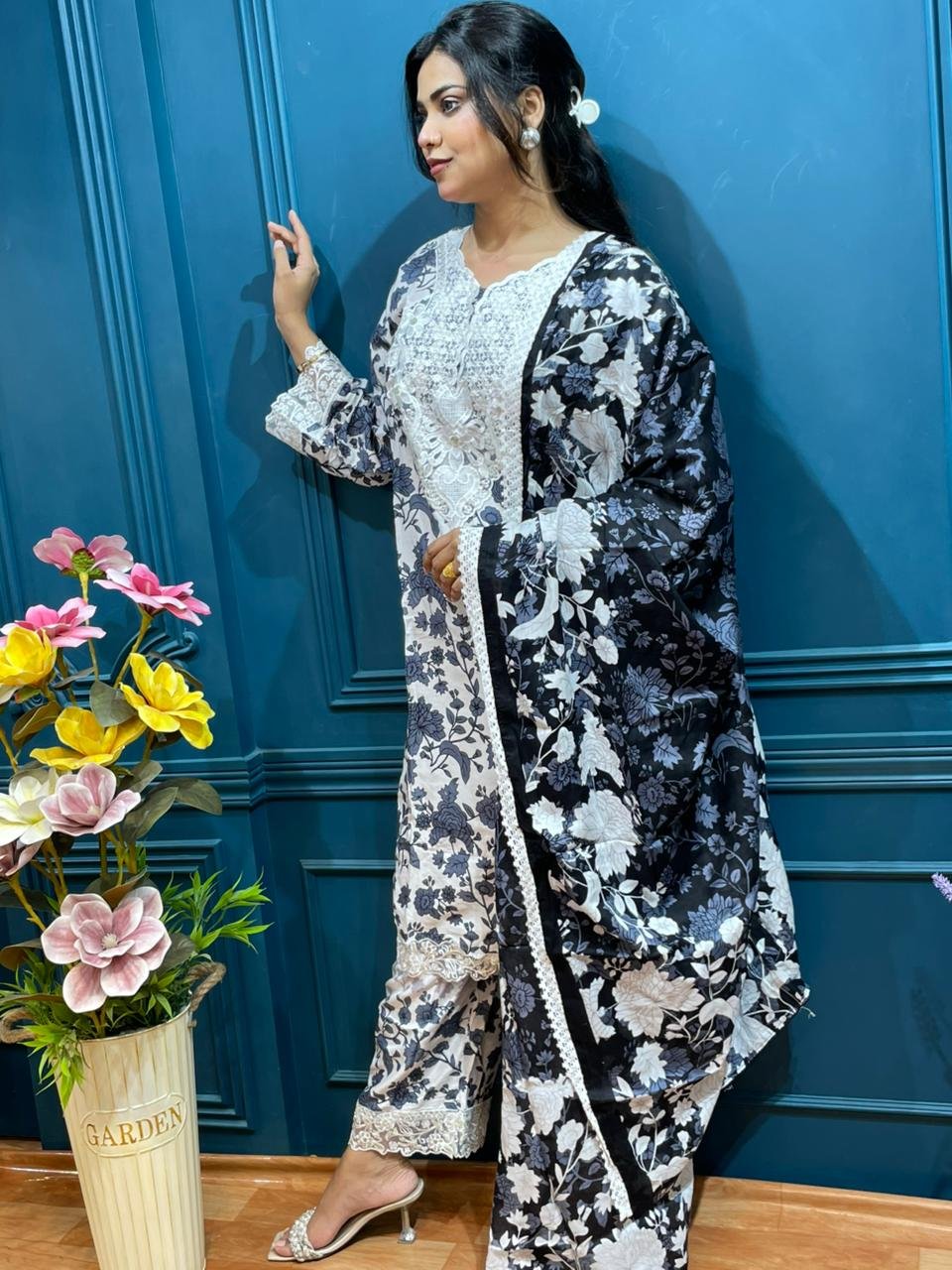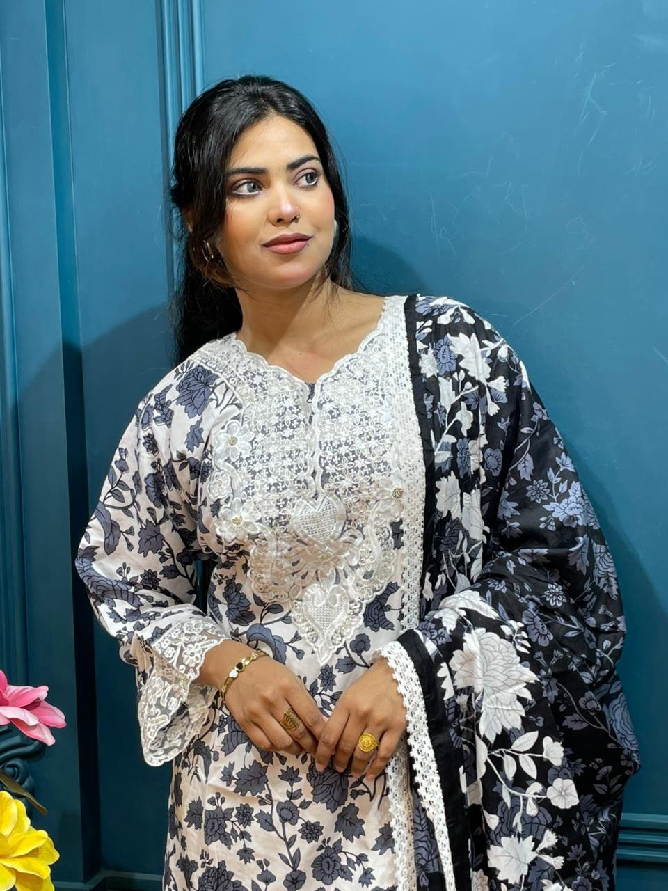 - Strong Pakistani designer vibe with floral prints + lace embroidery
