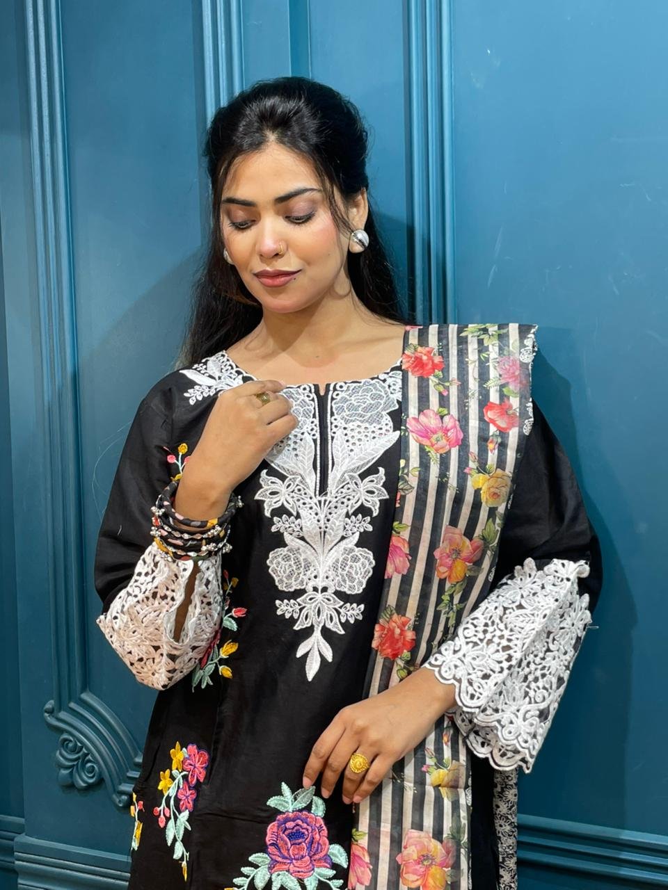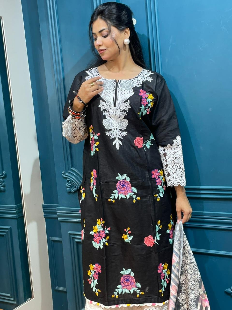 - Fabric: Looks like cotton/silk blend or lawn with embroidery